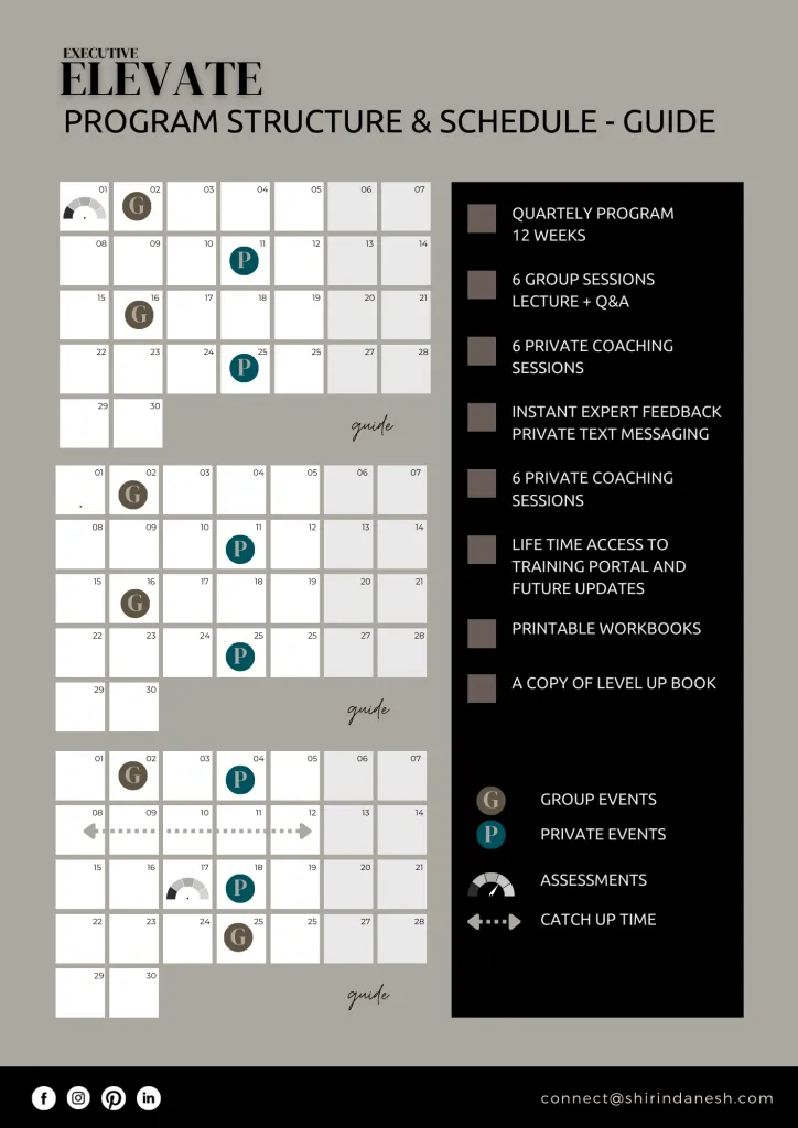 Whether you're looking for executive career elevation or a confidential transition into entrepreneurship, we ensure that the program aligns with your calendar ... so you gain the results without disruption.